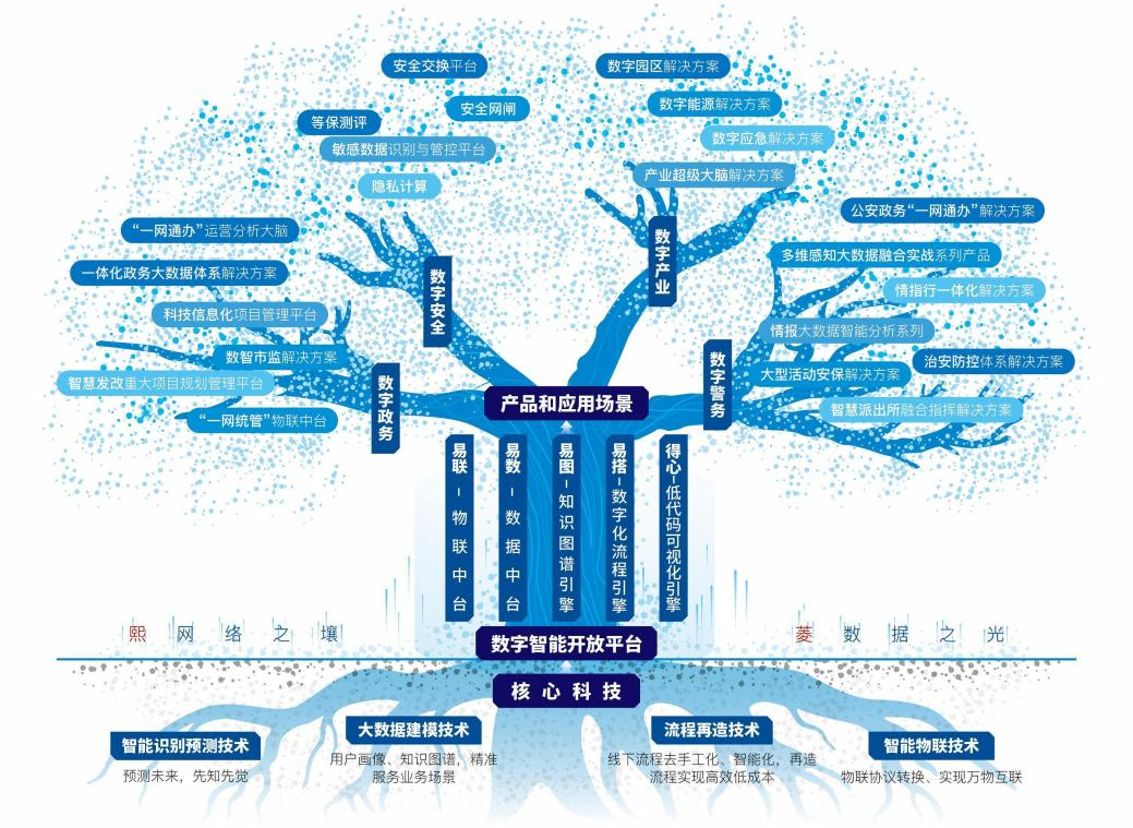 自研的一套以智能识别预测、大数据建模、流程再造、智能物联四大核心科技为支撑的底层架构平台,可为数字警务、数字政务、数字安全、数字产业等领域的大数据智能应用和产业数智化转型,提供端到端的全链条技术支撑。